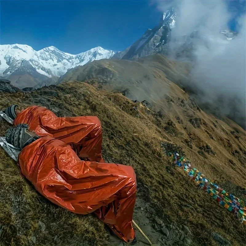 Survival tent for -- the bright color and reflective aluminum foil will help you being found by other people when you are traped.
